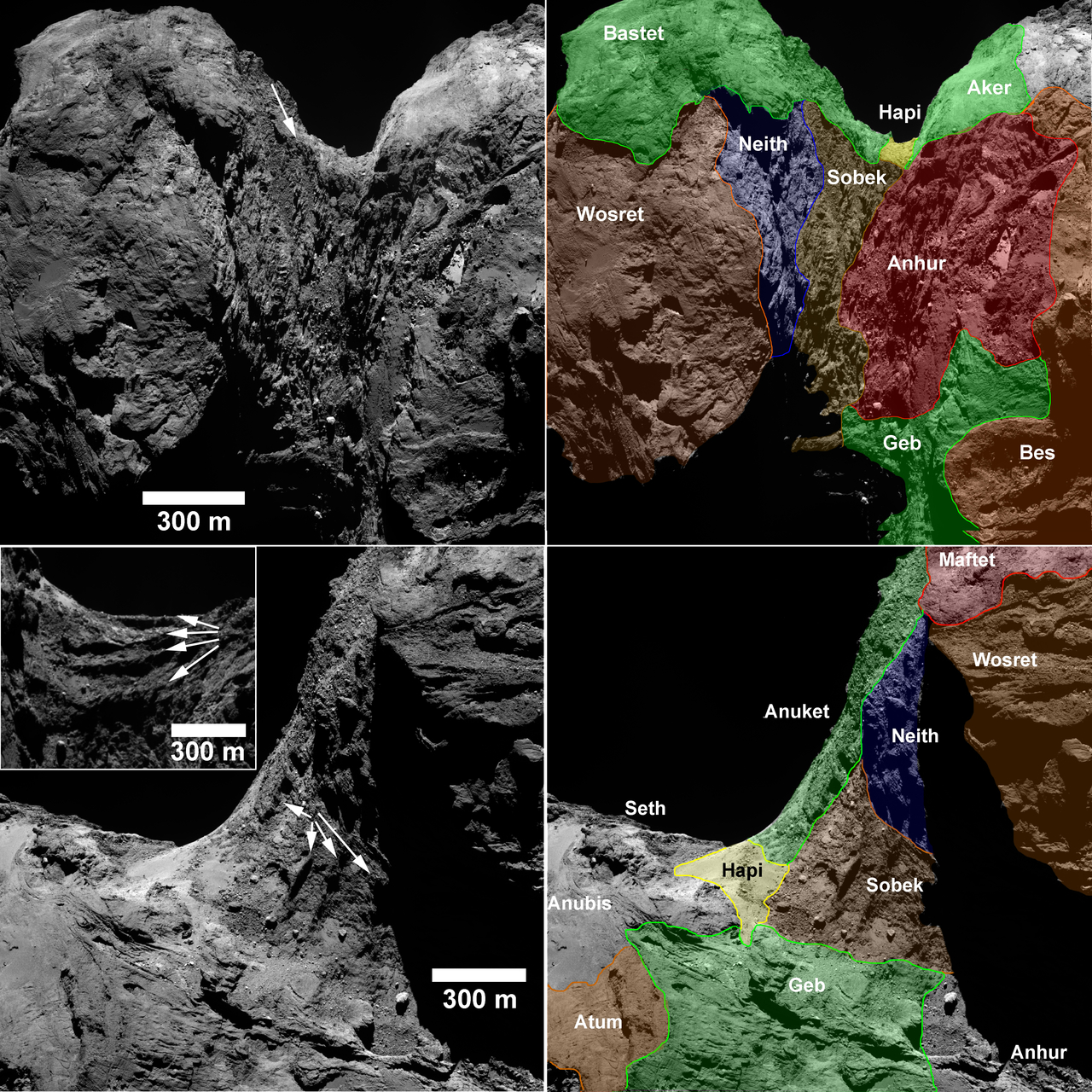 In total, twenty-six geological regions have been identified on 67P/C-G. These have been named after ancient Egyptian deities. Regions on the small lobe, sometimes referred to as the 'head' of the comet, are named after Egyptian goddesses (Anuket, Bastet, Hathor, Hatmehit, Ma’at, Maftet, Neith, Nut, Serqet, Wosret), while regions on the large lobe, or 'body' of the comet, are named after gods (Anhur, Anubis, Aker, Apis, Ash, Aten, Atum, Babi, Bes, Geb, Imhotep, Khepry, Khonsu, Seth). The two regions on the neck of the comet are named after the Nile gods, Hapi and Sobek.