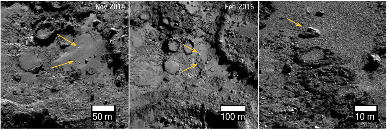 The images were taken by Rosetta's OSIRIS camera on 22 November 2014 (left), 10 February 2016 (middle) and 25 May 2016 (right), with resolutions of 0.5 m/pixel, 0.9 m/pixel and 0.1 m/pixel, respectively.