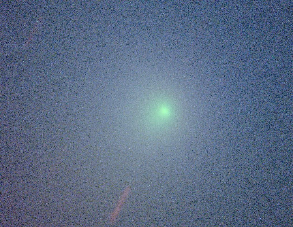 The green diffuse cloud is the comet's coma – the green colour being caused by carbon (C2) molecules. The narrow-band filters allow light from different gasses in the coma to be separated, giving a measurement of the comet's composition. The three filters used here isolate CN (blue), C2 (green) and sunlight reflected from dust grains (red). The coma's asymmetry is visible in the image. The reddish stripe in the lower part of the image is a background star, trailed due to the fact that the telescope was tracking the fast-moving comet