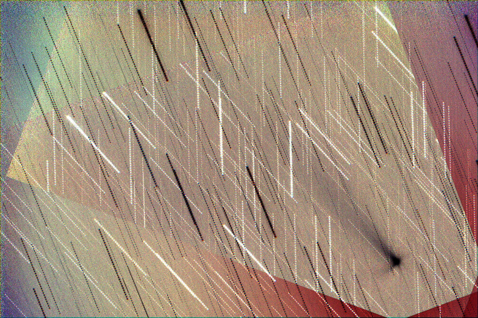 The comet is visible in the lower right part of the image, with its tail extending to the upper left. The diagonal stripes across the image are star trails.
