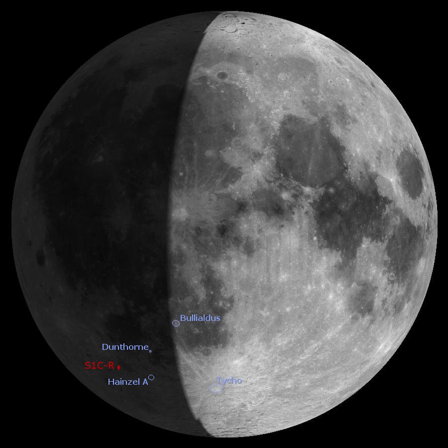 This view shows the lunar phase on the night before nominal impact, at 05:42UT on 2 September 2006. The red diamond marks the SMART-1 Crash Site as Revised on 6 August 2006 (S1C-R) with the coordinates 46.25° W, 36.44° S.