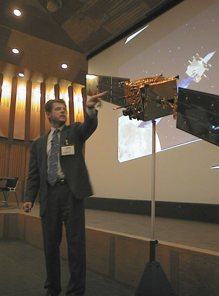 Project manager Giuseppe Racca uses the new quarter-scale model to present SMART-1 at ICEUM4.