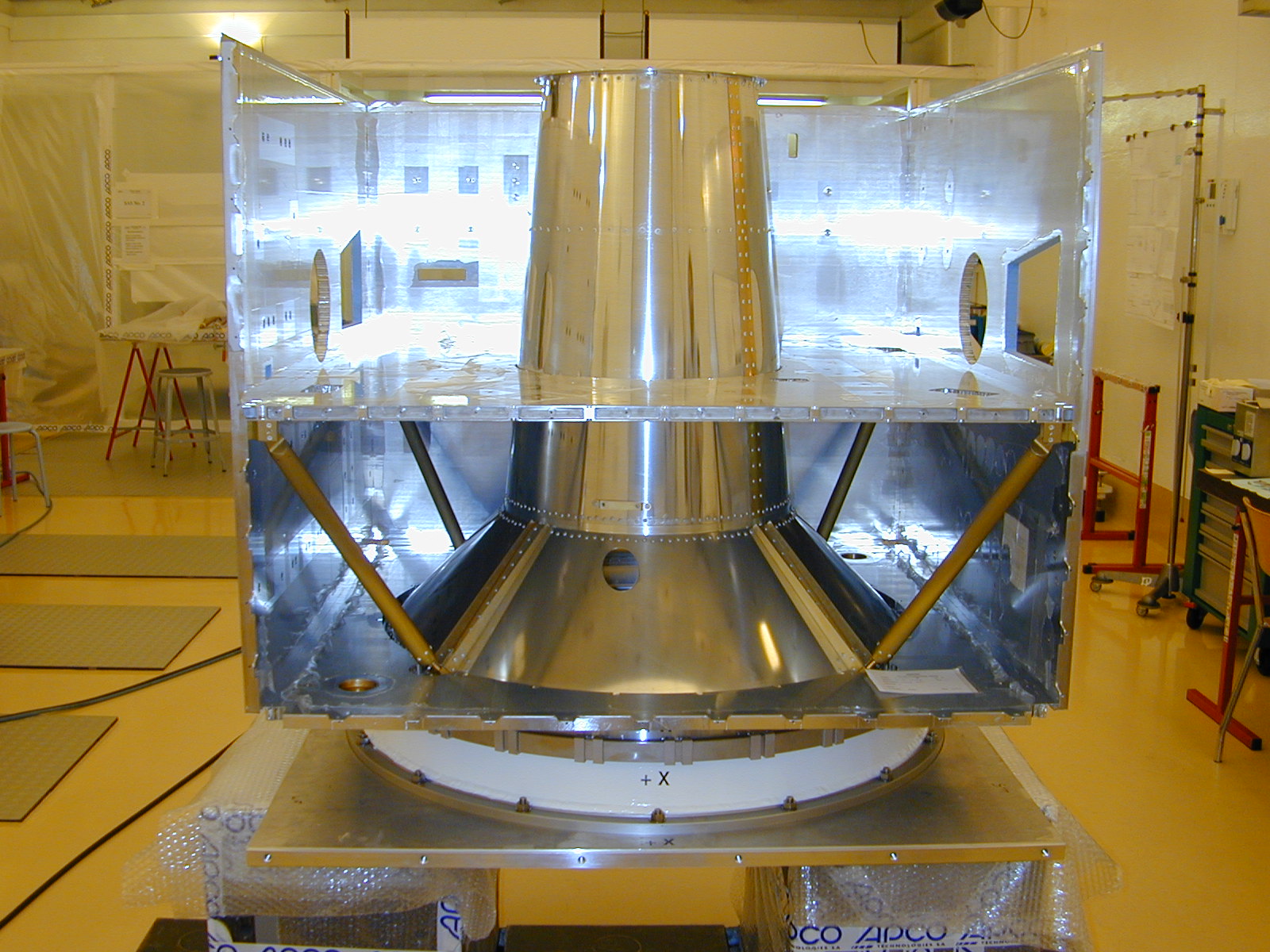 The opened primary structure of SMART-1 with the central cone mounted on the ground-handling adapter.