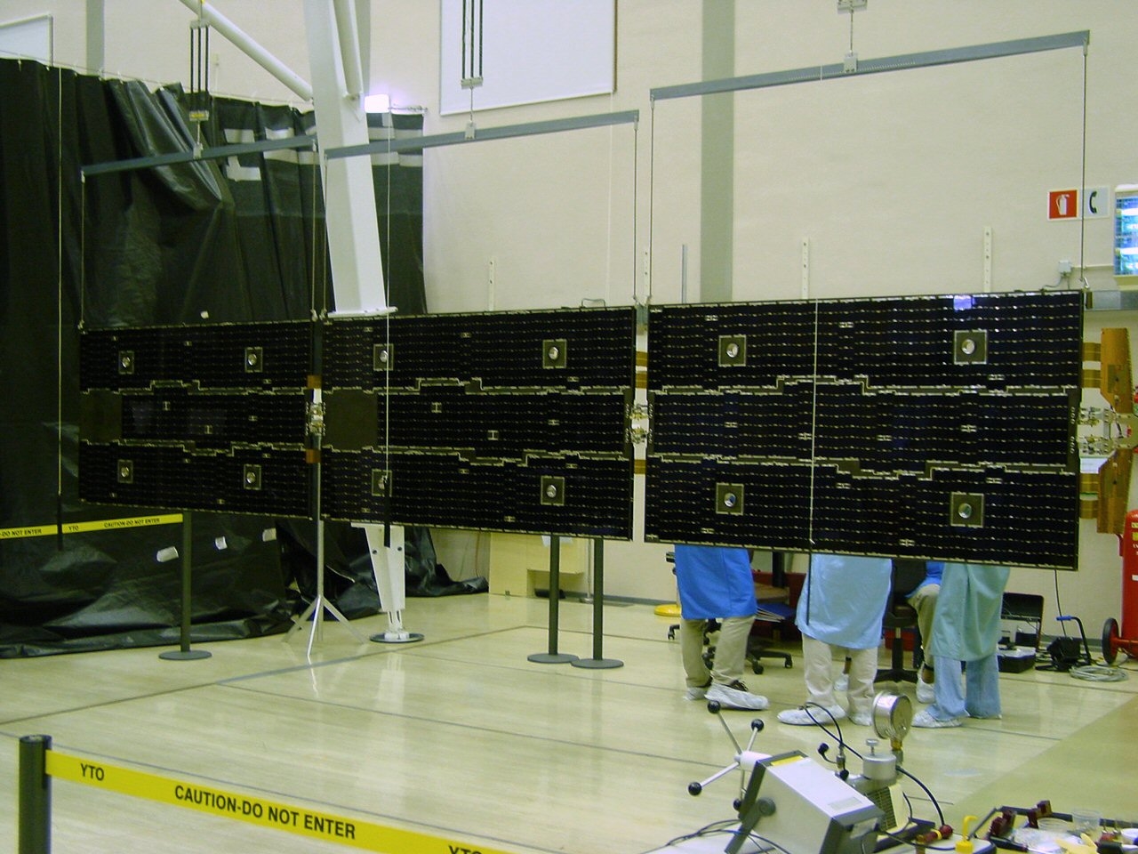 SMART-1's solar panels are tested in the ESTEC clean room. Note the framework supporting the panels to simulate a gravity free environment.