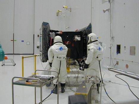 Two technicians from Alcatel Space Cannes fuel the SMART-1 spacecraft with hydrazine in the hazardous materials facility S5B at CSG.