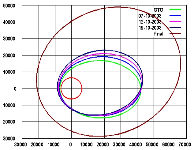 In this diagram the GTO, the osculating orbits at launch and at different times are plotted. The large orbit, marked 'final', is the one SMART-1 is expected to achieve at the end of the radiation belt escape in about two months. The Earth is represented by the red circle at the origin.