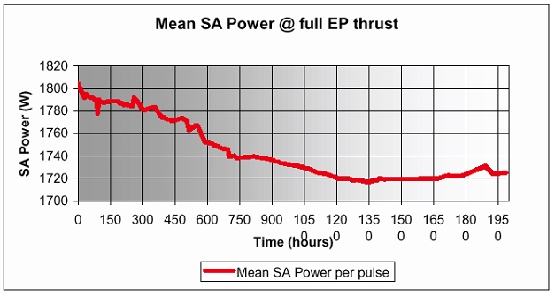 This graph shows the measured power produced by the solar arrays when the Electric Propulsion is operating at full power, starting from the beginning of the mission up to 21 December 2003.