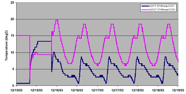 This week the spacecraft was rotated back to nominal attitude and hence the star tracker optical head #2 was experiencing high temperatures again up to 18 °C, while the optical head #1 was always staying below 10 °C.