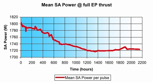 This graph shows the measured power produced by the solar arrays when the EP is operating at full power, starting from the beginning of mission.