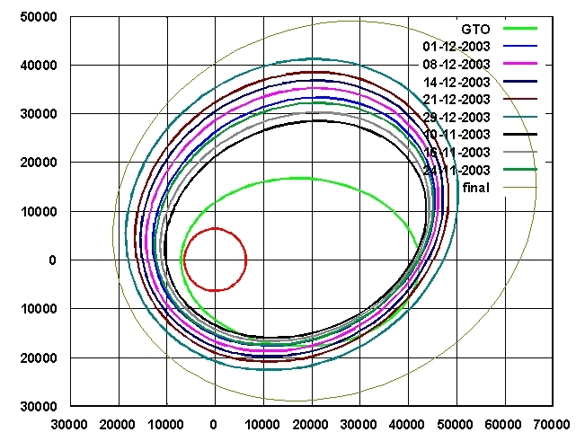 The osculating orbits at launch (GTO) and at different times are plotted. The large orbit, marked 'final', is the one we expect to achieve at the end of the radiation belt escape (pericentre larger than 20 000 km). From the start, the electric propulsion system has managed to increase the semi-major axis of the orbit by 11 039 km, increasing the perigee altitude from the original 656 km to 10 857 km and the orbital period by about 8 hours, from the initial 10 hours 41 minutes to the present 18 hours and 37 minutes.