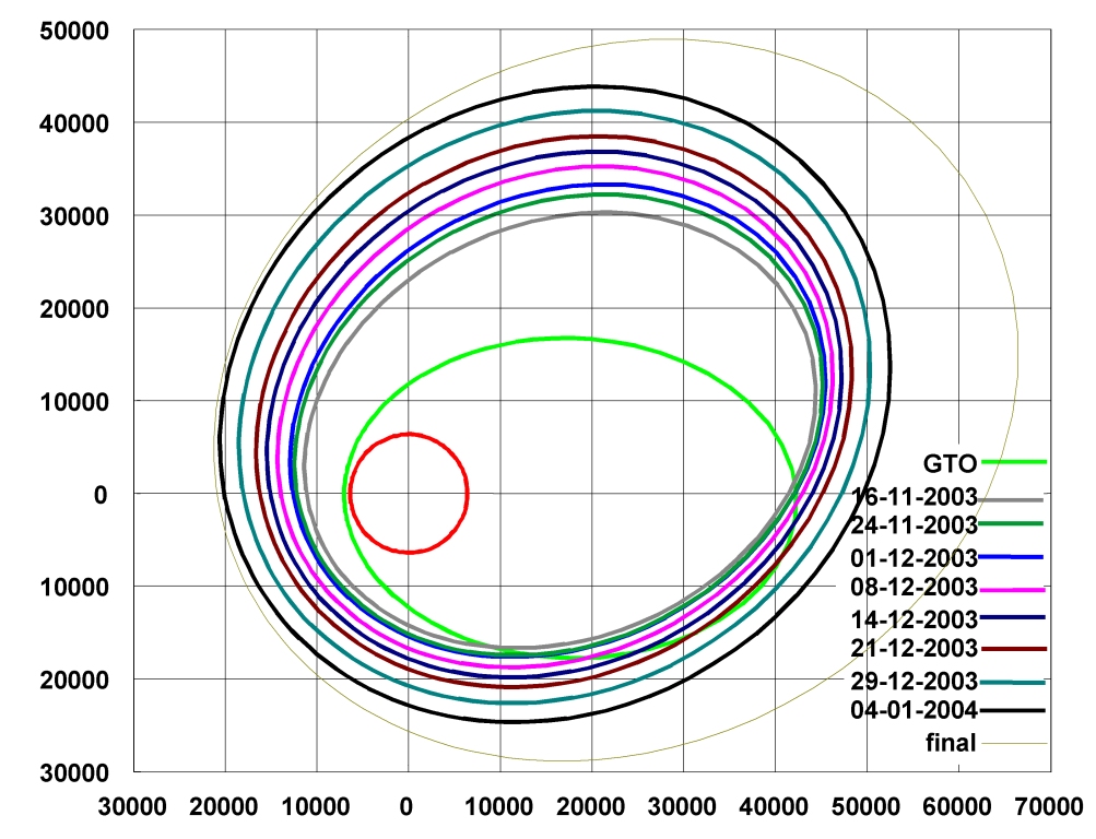 In this diagram the osculating orbits at launch (GTO) and at different times are plotted. The large orbit, marked 'final', is not exactly the same as the one we expect to reach on 7 January. This is due to the change in strategy devised in order to avoid an excessive increase of the apogee height, which would have produced several long eclipses in March (Status Report No. 11, 16 December 2003). The thrust arcs, for the same reason, will, for the next few weeks, be concentrated for a few hours around the perigee point in order to efficiently tune the altitude of the apogee to the maximum allowable duration for the March eclipses (2 hours and 15 minutes).