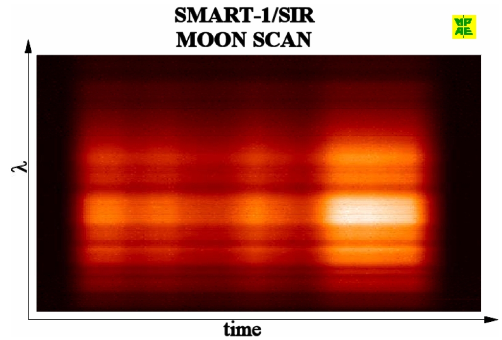 The SIR Infrared spectrometer first light was on the Moon during a scan to calibrate the alignment and sensitivity of the instrument. SIR has 256 colour channels that will permit to chart lunar minerals from their spectral fingerprints.