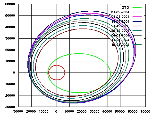 Displayed in the plot are the osculating orbits at launch (GTO) and at different times throughout the mission. Since the start of the mission the electric propulsion engine has changed the orbital parameters as follows: