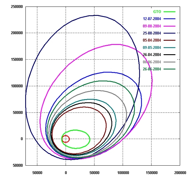 In this diagram the osculating orbits at launch (GTO) and at different times are plotted. The large effects on the orbit expansion, that the combination of the operations of the electric propulsion together with the Moon encounter have, are clearly visible. The Moon effects are mainly in the increase of the perigee altitude and in the rotation of the line of apsides (change in argument of perigee).