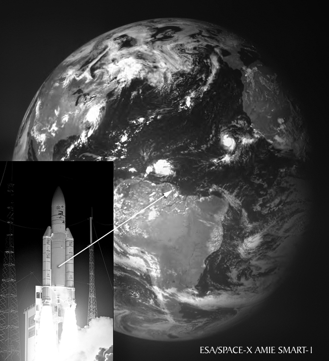 On 14 August, AMIE was pointed back at Earth and took this image showing southwest Europe, west Africa, North America and South America. The arrow indicates SMART-1's launch site at Kourou, French Guiana.