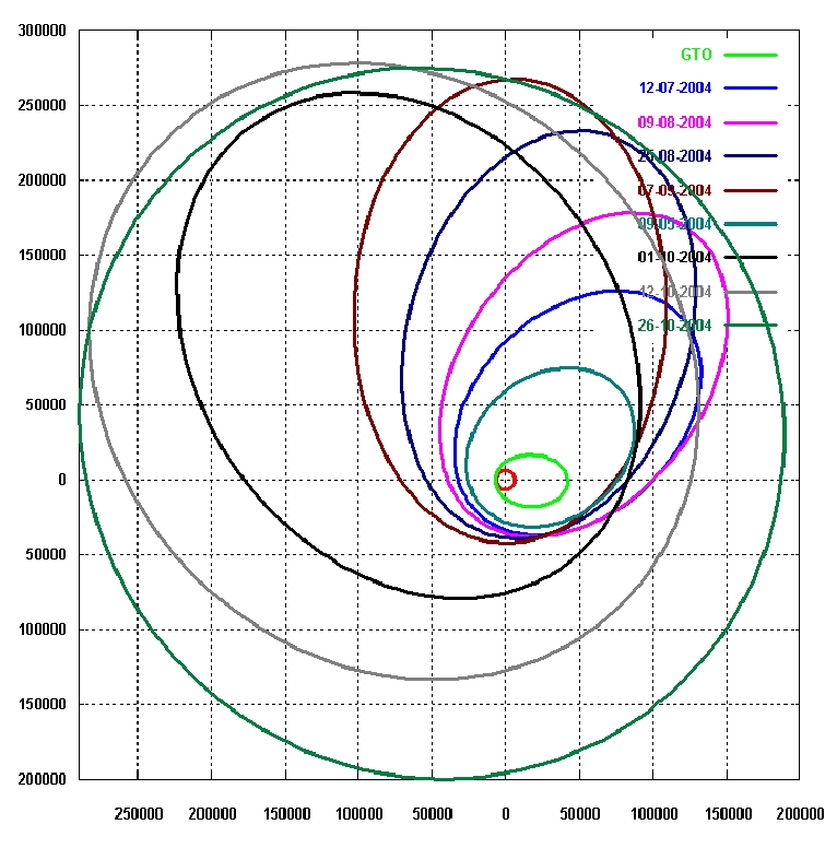 Also note the change in the orbit inclination, which has now reached 20°. As explained in status report No. 29, it was mainly the task of the last resonance to shift the orbit plane of the spacecraft towards the the lunar orbit plane, which is inclined at 28° with respect to the Earth equator (it varies between 28° 35' and 18°21' with a period of 18.6 years).
