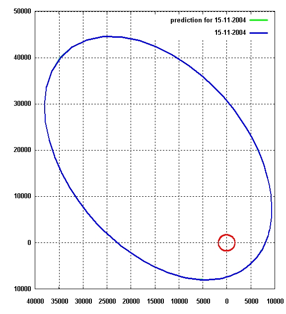 SMART-1's first lunar orbit, both predicted (green line) and measured (blue line). The orbit as predicted by the flight dynamics team matches the actual orbit very accurately, making the two ellipses overlap in this plot.