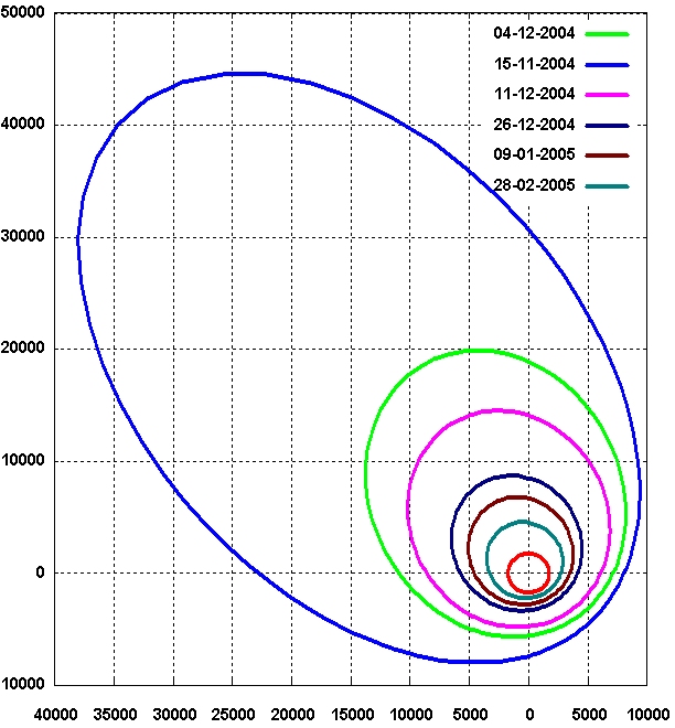 This diagram shows the SMART-1 osculating orbit at several dates during the spiralling in to the final operational orbit.