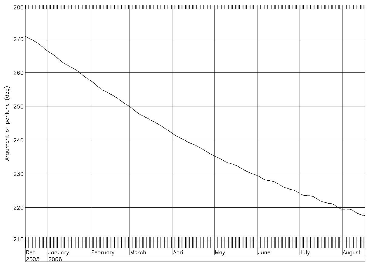 This plot shows the operational orbit's argument of perilune with respect to the inertial Moon equatorial reference system, for the period December 2005 - August 2006.