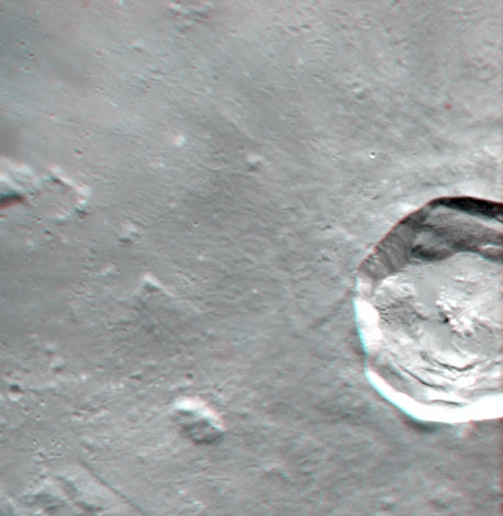 A 3D anaglyph image of crater Kepler on the lunar surface. The image can be viewed with either green/red, or blue/red glasses. A description of the crater is given under the associated overhead image.