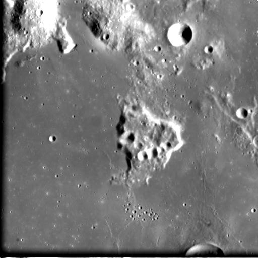 The 16km diameter crater Gruithuisen (depth 1.9 km) is only just visible on the lower edge of the image. Either side of the crater is Dorsum Bucher a small ridge feature which extends for 90 km.