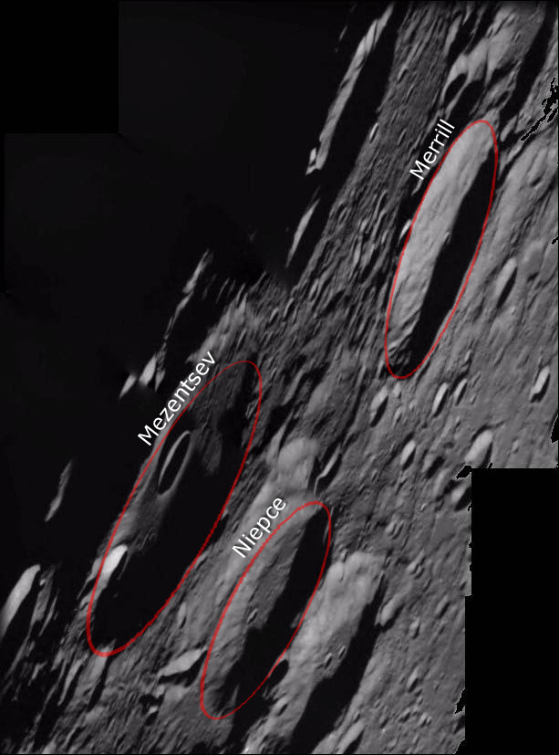 The largest craters in this image are Mezentsev, Niepce and Merrill. Mezentsev is an eroded crater 89 kilometres in diameter and centred at 72.1° N, 128.7° W. A smaller cup-shaped crater resides inside Mezentsev. Niepce and Merrill both have a diameter of 57 km and are located at 72.7° N, 119.1° W, and 75.2° N, 116.3° W, respectively.
