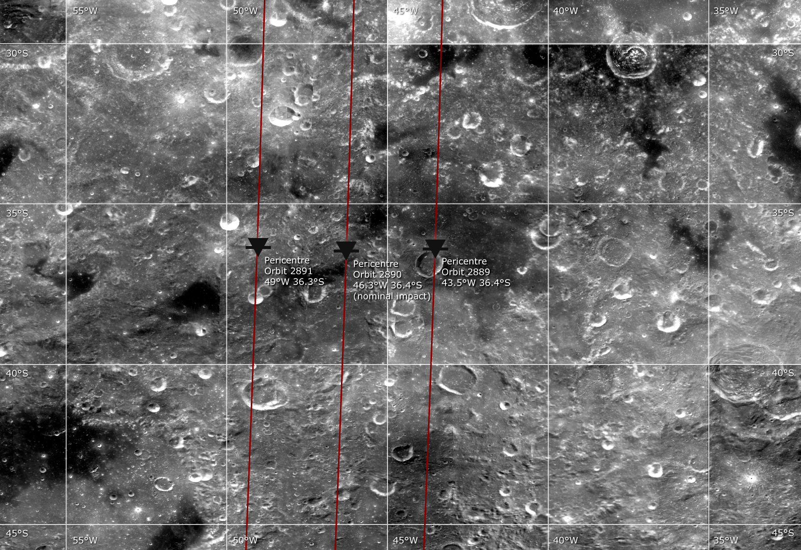 Map of the Lacus Excellentiae region, showing the nominal SMART-1 impact orbit (central red line: orbit 2890) and possible impact location at perilune on the lunar surface. The two adjecent orbits, 2889 and 2891, and their perilune locations are also indicated. Note that 1 degree of latitude corresponds to 30 km on the Moon, and that one arcsec from Earth subtends 1.8 km on the Moon centre.
