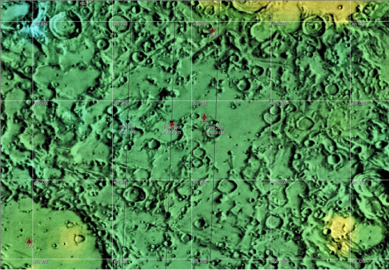 Moon topography map of Lacus Excellentiae, showing the nominal SMART-1 impact orbit (central black line: orbit 2890) and possible impact location. The two adjecent orbits, 2889 and 2891, and their perilune locations are also indicated. Note that 1 degree of latitude corresponds to 30 km on the Moon, and that one arcsec from Earth subtends 1.8 km on the Moon centre.