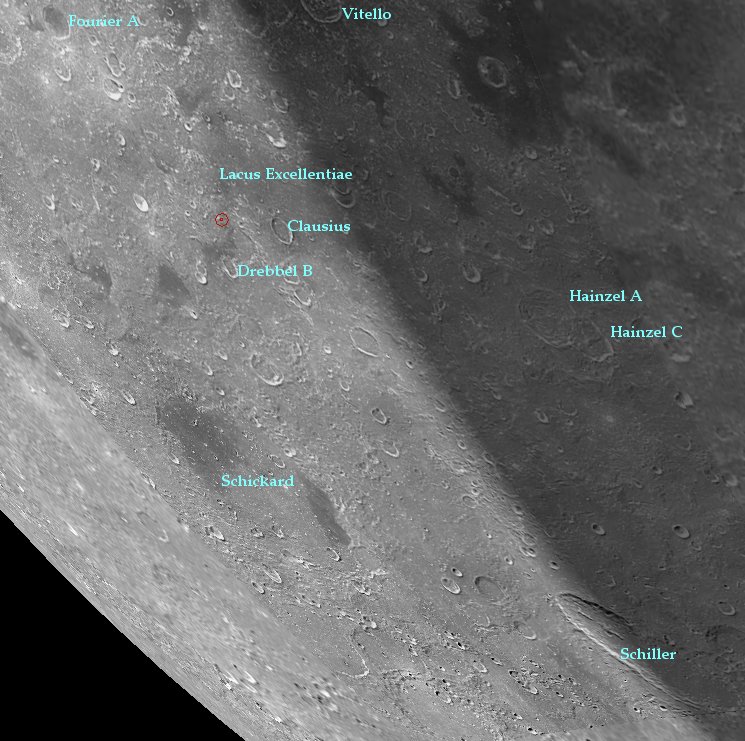 The SMART-1 impact is expected on 3 September 2006 in the Lacus Excellentiae region, at the top of the U shape feature situated north of the crater Drebbel B. The nominal impact position is marked by the red circle.