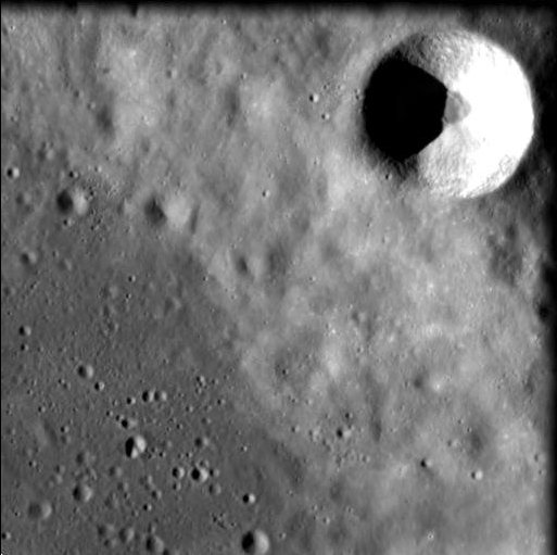 The image shows the north-eastern part of crater Cuvier, an old circular crater on the lunar near side, 77 kilometres in diameter. The smooth crater floor is visible in the lower left quadrant of the image. Situated on the rim of crater Cuvier at the top right in this view is the smaller satellite crater, Cuvier C, with a diameter of 9 km.