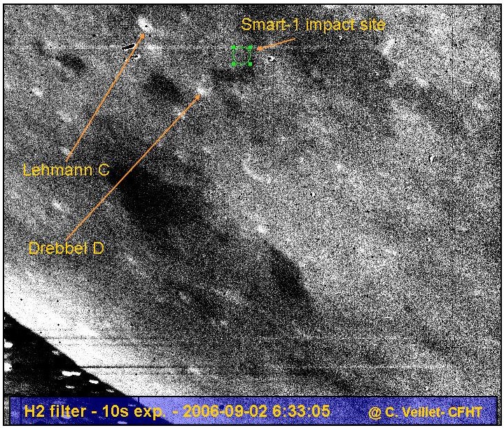 An image from the CFHT showing the projected impact site for SMART-1 24 hours before impact. The image was acquired with the 3.6 m telescope using an H2 filter with a central wavelength of 2122nm and a bandwidth of 32nm.
