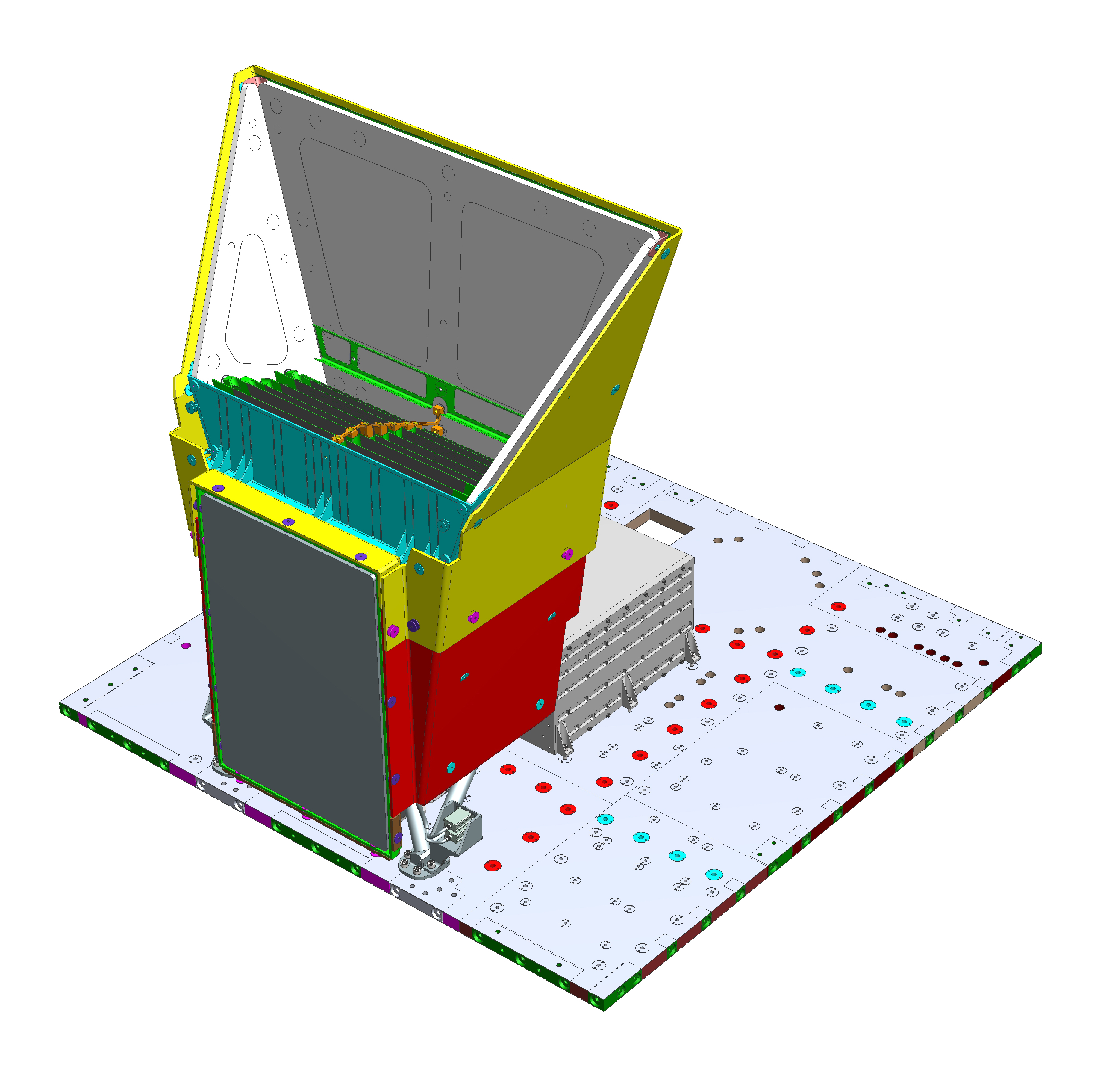 The SXI is equipped with two large X-ray-sensitive CCD detectors – located in the optical bench behind the radiator – covering the 0.2 keV to 2.5 keV energy band, and has an optic field of view spanning 15.5° × 26°.