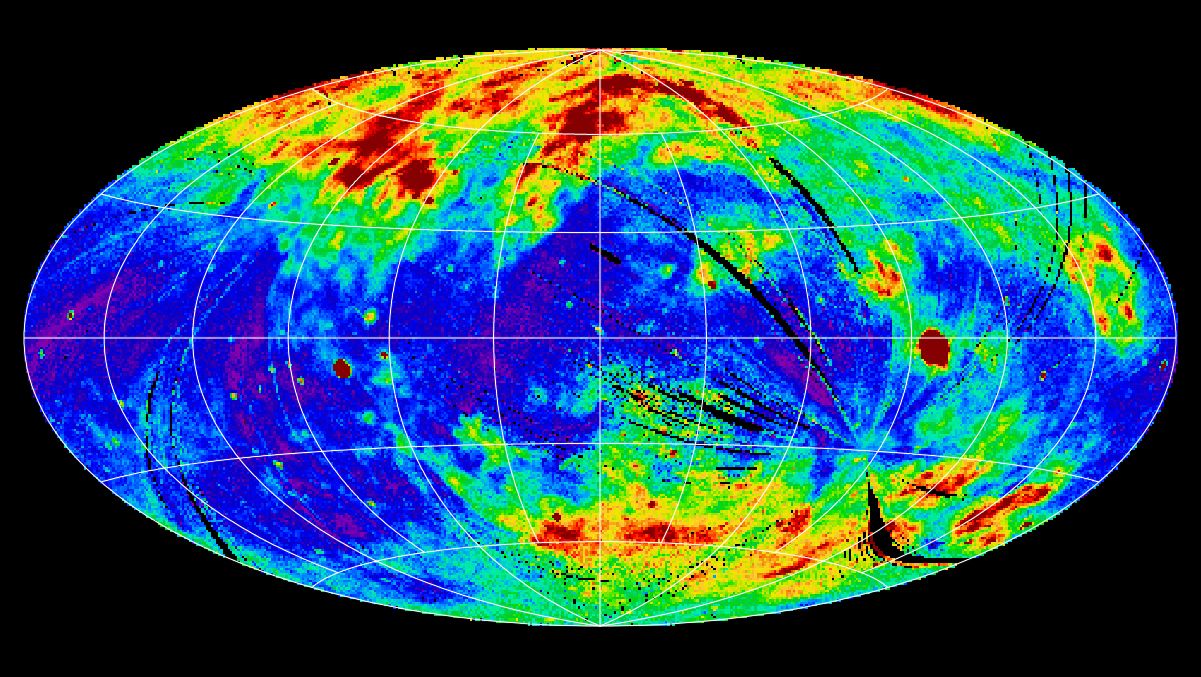 The strong striping of the data is an artifact of the contamination and is caused by several processes, with solar X-rays scattered by the residual atmosphere along the line of sight being a major contributor. The image is an Aitoff-Hammer equal-area projection in Galactic coordinates centred around the Galactic centre.