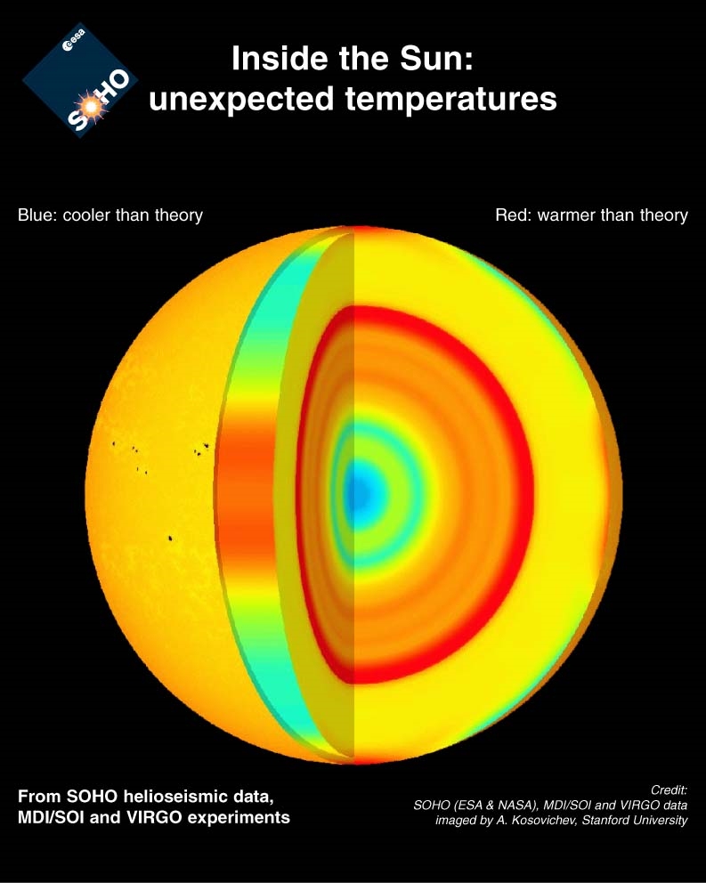 Concentric layers in a cutaway image show oddities in the speed of sound in the deep interior of the Sun, as gauged by two instruments on the SOHO spacecraft. MDI/SOI measures vertical motions due to sound waves reverberating through the Sun, at a million points on the visible surface. VIRGO detects the solar oscillations by rhythmic variations in the Sun's brightness.