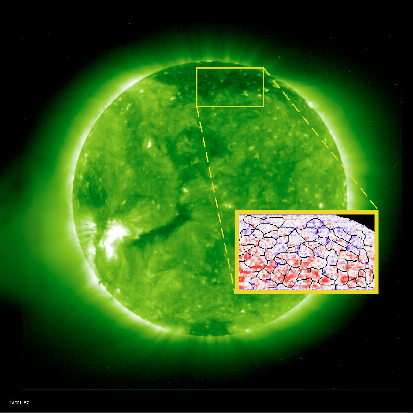 Extreme ultraviolet images of the Sun taken with the EAS/NASA Solar and Heliospheric Observatory (SOHO) Spacecraft revealing gas at 1.5 million degrees shaped by magnetic fields. The colours are false; green in the original Extreme Ultraviolet Imaging Telescope (EIT) instrument color scheme. Bright regions indicate hot, dense plasma loops with strong magnetic fields, while dark regions imply an open magnetic field geometry, and are the source of the high speed solar wind.