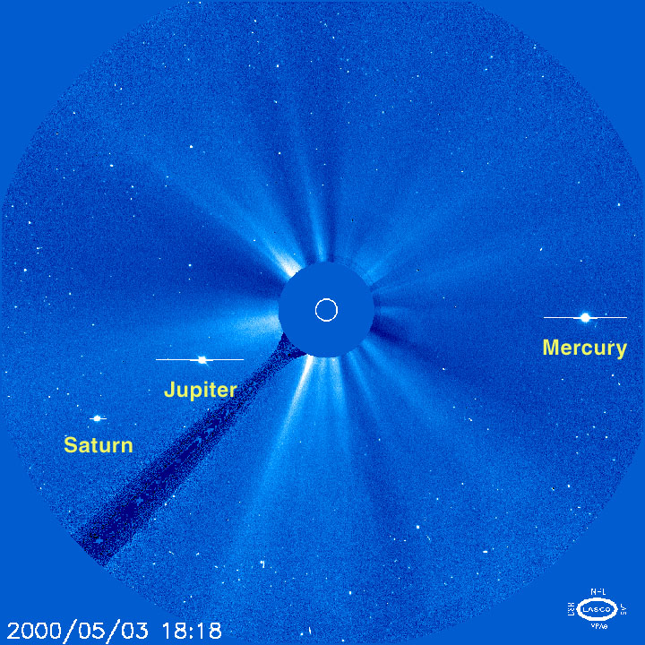 Three planets are almost in line with the Sun itself, which is the white ring inside the mask that blocks its direct light. The horizontal streaks on the planets are instrumental effects.