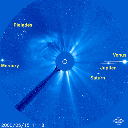 The LASCO C3 instrument on SOHO uses a mask to blot out direct sunlight, and it has a wide enough field of view (15 degrees) to take in four planets (Mercury, Venus, Jupiter, Saturn)in the same picture. Also conspicuous in the picture is a famous star cluster, the Pleiades.