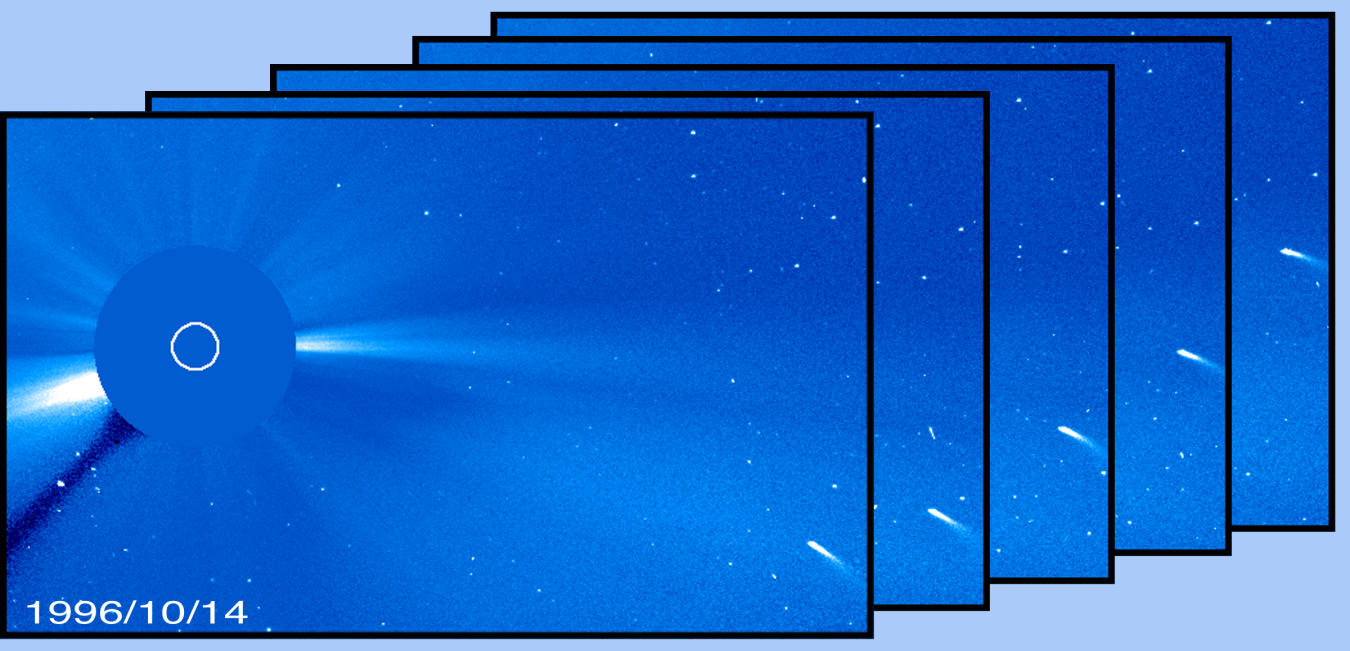 These images of Comet Machholz 1 were obtained by the Large Angle and Spectrometric COronagraph (LASCO, C3) on SOHO on 14 October 1996.