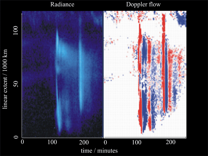 A cross-section of the solar atmosphere 40 000 kilometres above the solar surface and 110 000 kilometres wide (shown as a vertical strip) changes over a period of 4 hours (horizontal scale) as observed by SUMER on SOHO in the ultraviolet light from strongly ionised iron atoms (Fe XIX, 1118 angstroms).