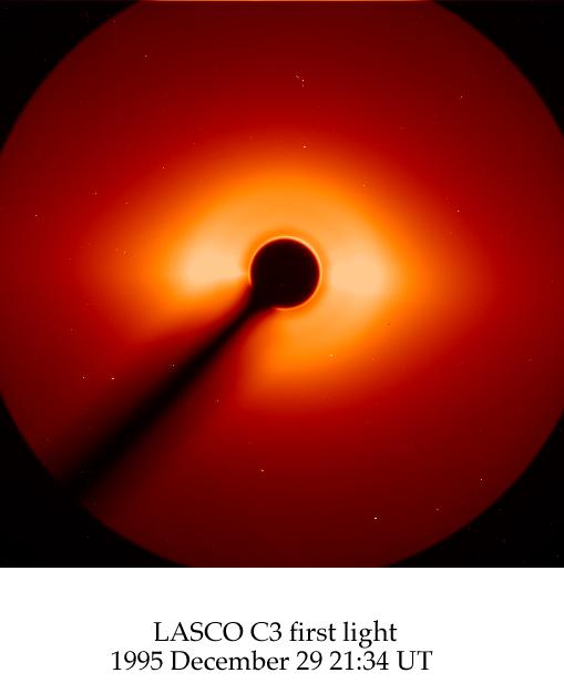 The solar corona through LASCO C3 instrument from 3.7 - 30 Rsun through the orange filter. Taken on 29 Dec 1995