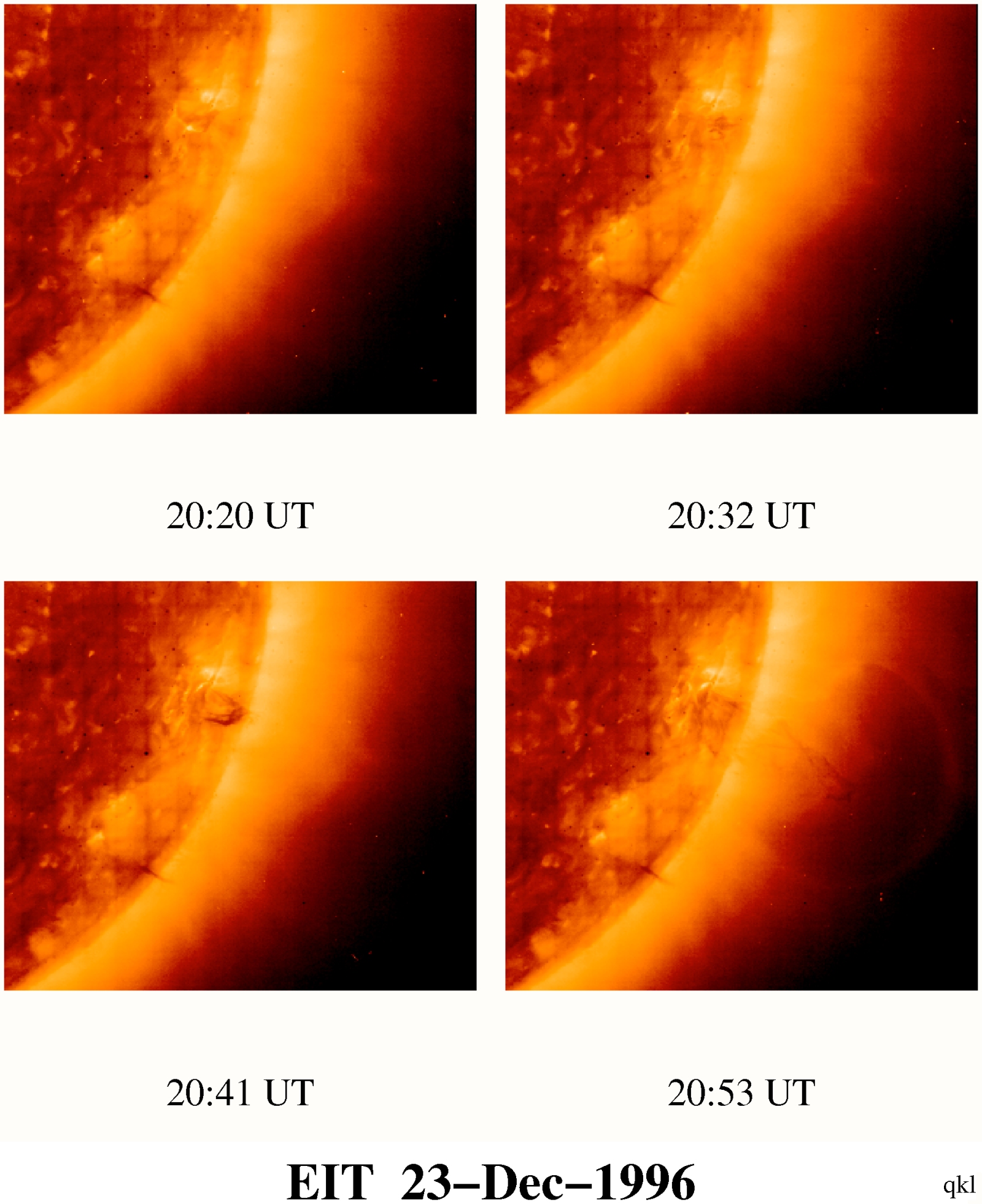Four images from the EIT instrument, taken in the ultraviolet coronal line of Fe XII, are shown in this image. Cool material (darker shades) ascends from the solar surface (20:32 UT) to form a loop like structure (20:41 UT), which explodes, reaching an altitude of 300 000 km in just 12 minutes. At 20:53 UT the material has accelerated to a velocity of 400 km per second. The cool material pushes a hot coronal shockwave seen as a ring of brighter material.