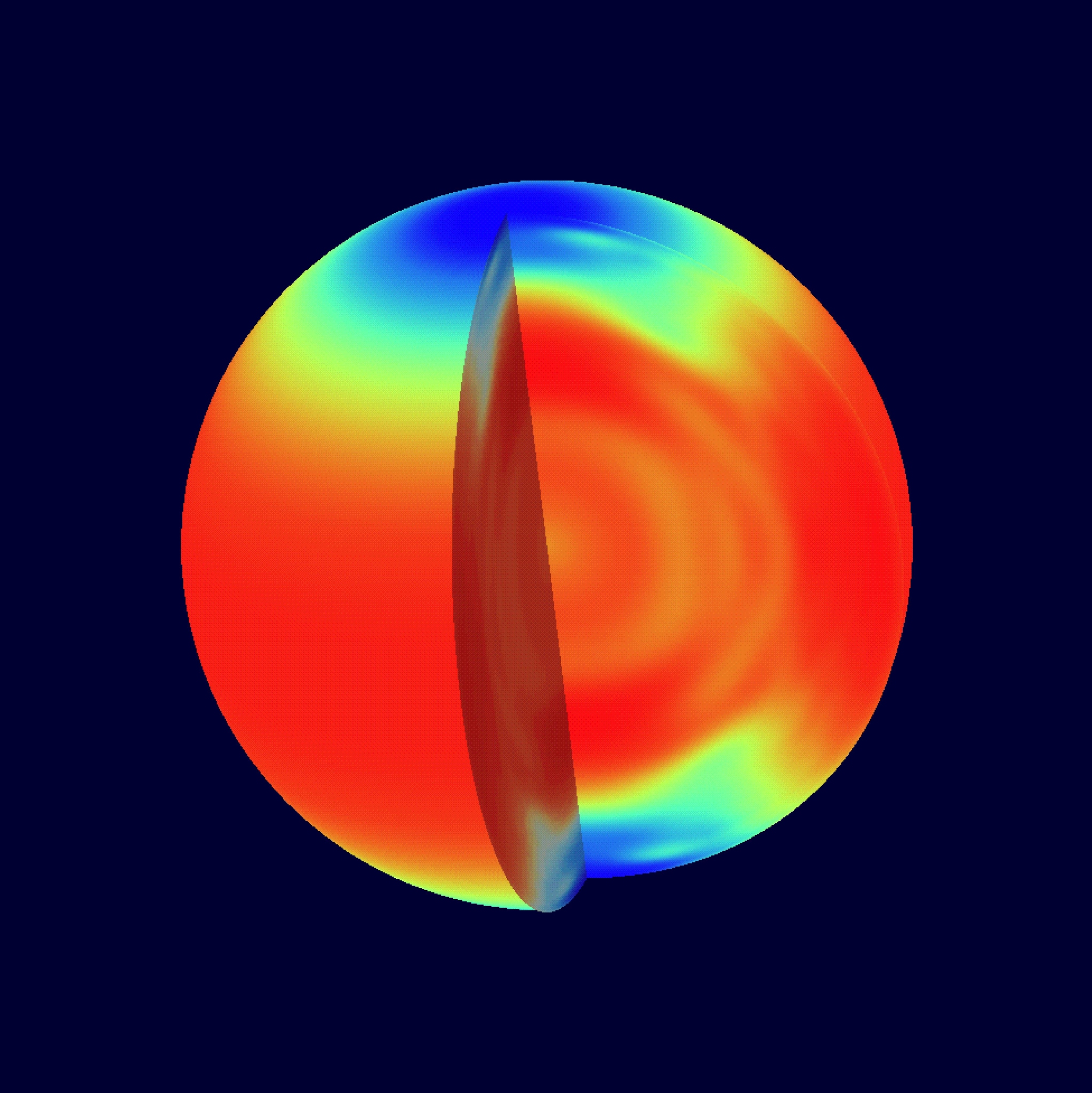 The sides of the cut show the rotation rate as it varies with depth into the sun and with latitude.