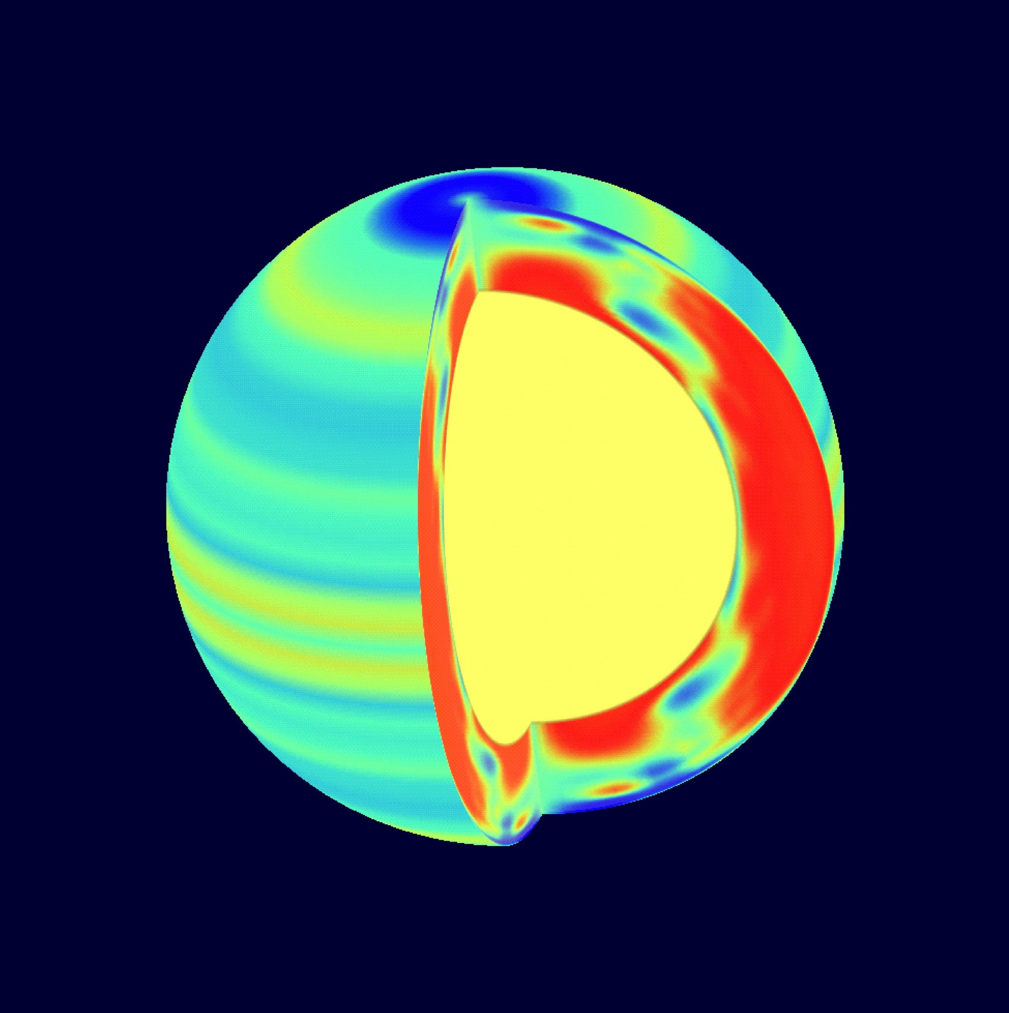 This image shows a different view of the Sun's rotation. In this figure we have removed the general variation from the equator to the poles. We computed the smooth variation of differential rotation in the Sun's surface, and subtracted that from the value at each latitude and depth. The result is shown as a speed of motion rather than rotation rate. Red-yellow is faster than average, and blue is slower than average. This highlights the smaller scale variations in the change in rotation from the equator to the poles. [For those who are interested, the term subtracted is of the form A + B*sin²(latitude) + C*sin4(latitude) where A = 450.78, B = -48.55, C = -67.76 all in nano-Hz]