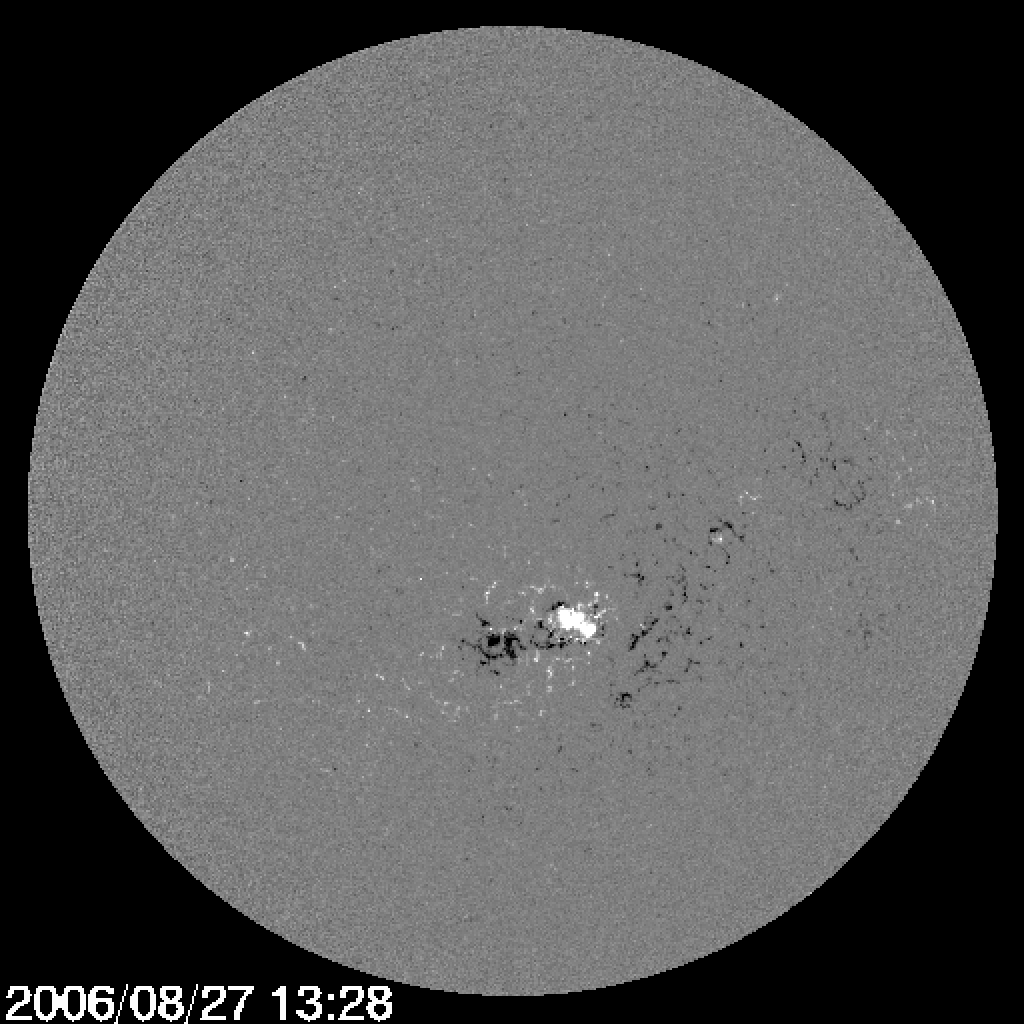 This magnetogram of the Sun's disk was obtained by the MDI instrument on board SOHO on 27 August 2006. The magnetogram shows the strength and sign of the magnetic field in the Sun's photosphere in greyscale: