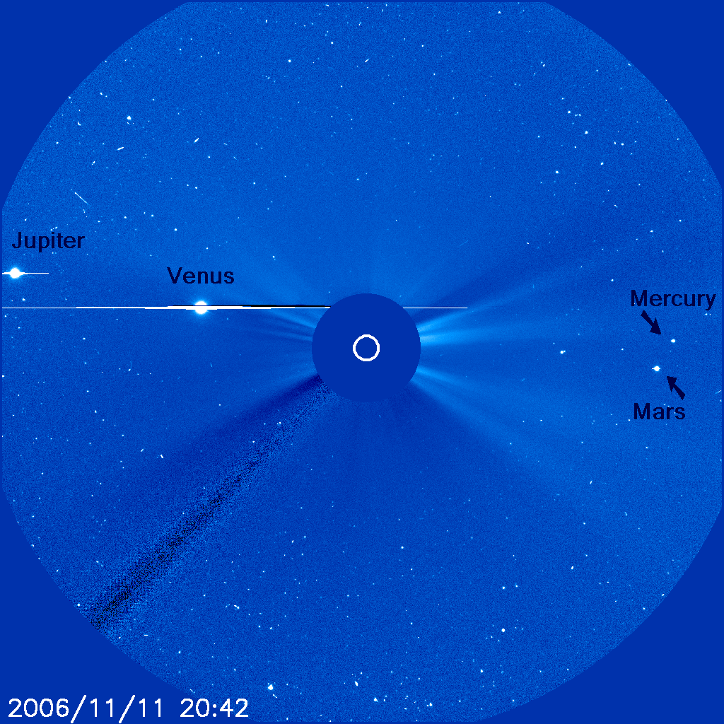 In this image, four planets are seen grouped around the Sun (indicated to scale by the white circle in the centre) with Jupiter and Venus bright enough to cause saturation of the detector resulting in the characteristic bright horizontal streaks.