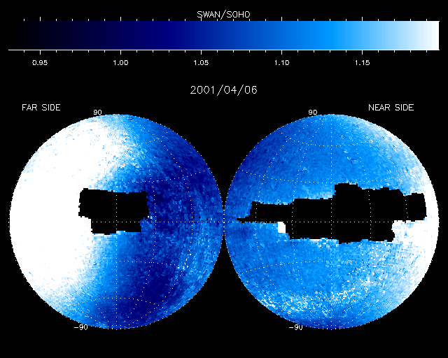 Activity on the Sun is revealed by the glow of hydrogen gas in space that is excited by ultraviolet rays from the Sun and subsequently detected by SWAN on SOHO. The SWAN (Solar Wind ANisotropies) instrument observes this Lyman alpha emission from the whole sky, and in this way gives information on the level of activity on both the Sun's near and far side.