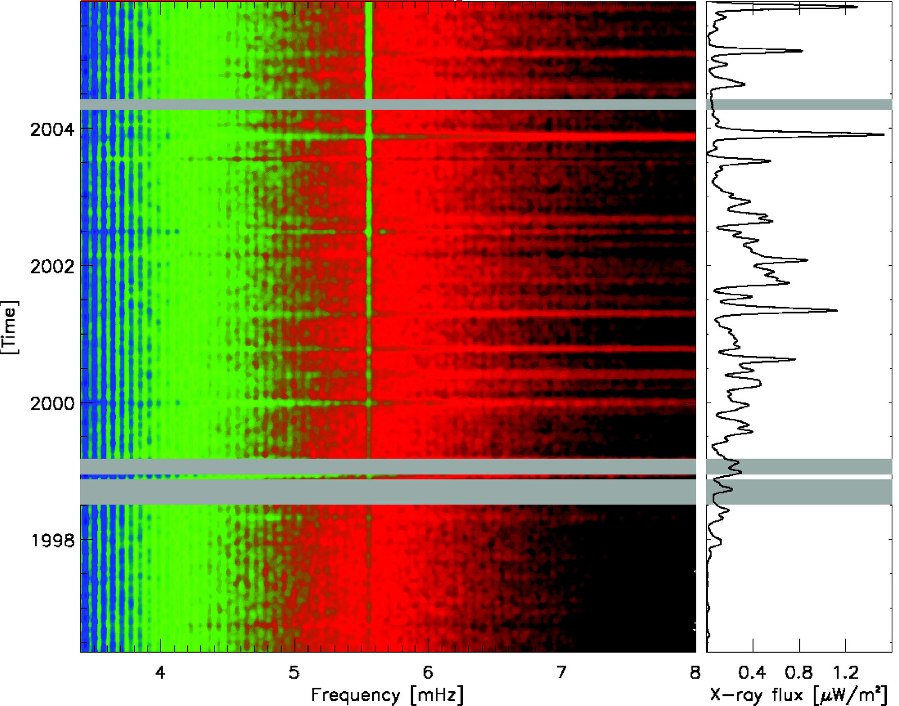 Frequency/time diagram of integrated sunlight from VIRGO data (left). Bright, horizontal lines are strongly correlated with solar flares, represented by the X-ray flux measured by GOES (right).