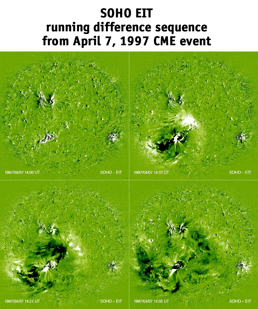 This sequence of images shows a wave propagating in the solar corona at a speed of about 300 kilometres per second. The four images have been taken over a time interval of just over half an hour. The moving wavefront is a result of a Coronal Mass Ejection (CME), a colossal eruption during which enormous amounts of gas are released from the Sun into outer space.