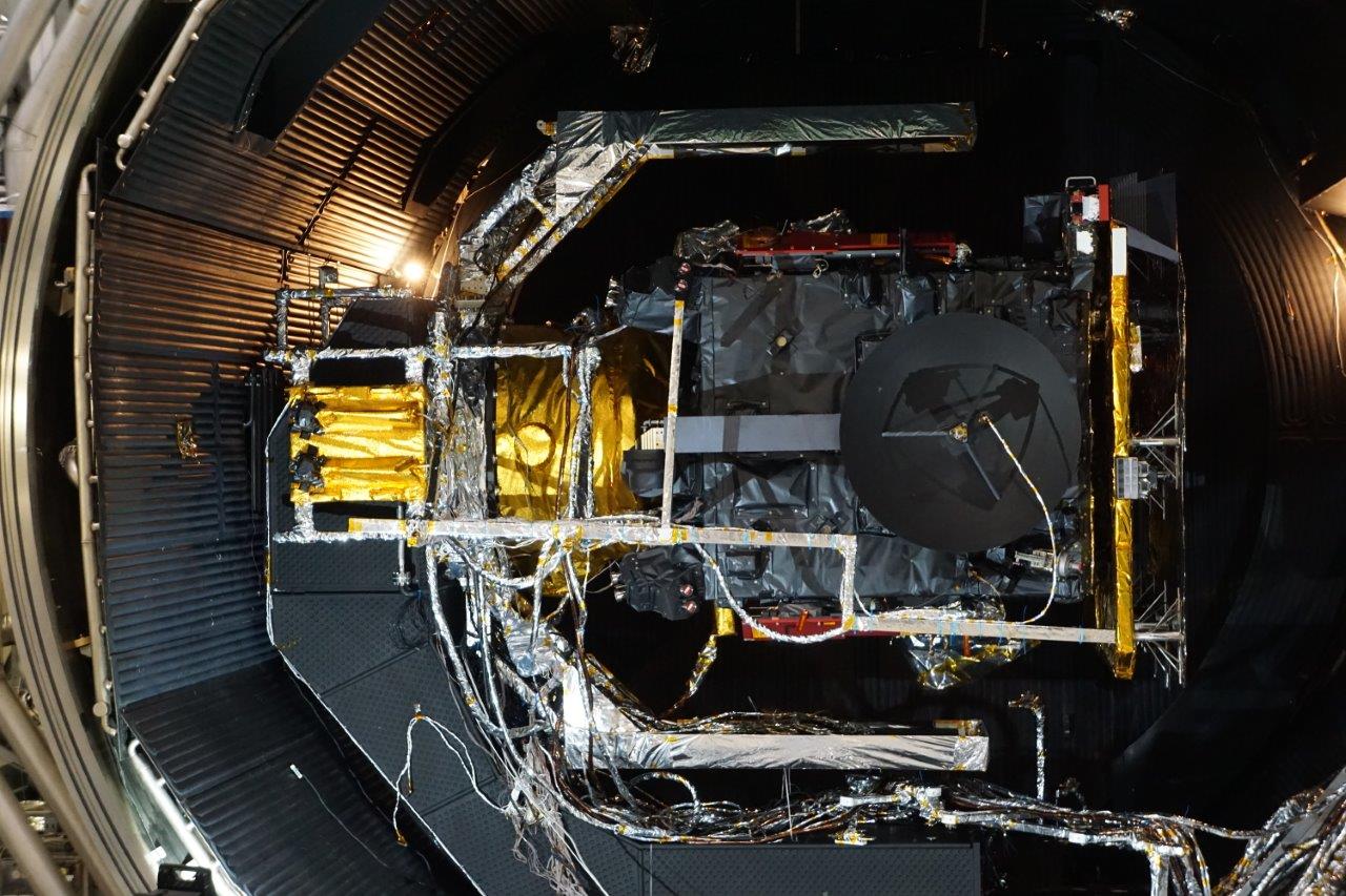 The Solar Orbiter spacecraft, ready to start the first phase of environmental testing in a special thermal-vacuum chamber in early December at the IABG facility in Ottobrunn, Germany. The high-gain antenna, which was integrated on the spacecraft in October, is visible in this view.