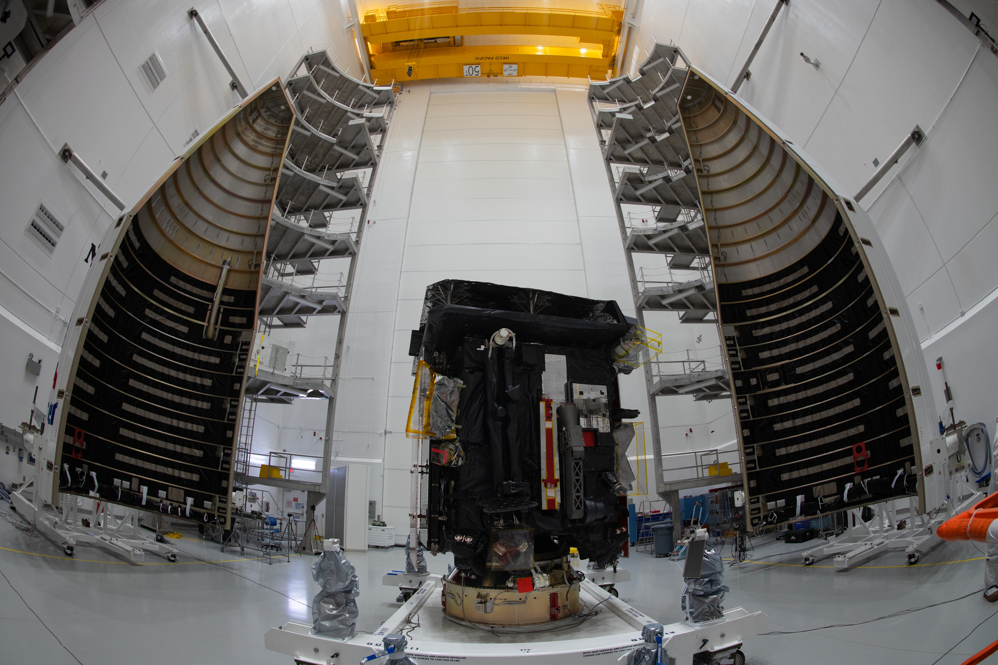 ESA's Solar Orbiter spacecraft being encapsulated into the fairing of the US Atlas V 411 rocket at the Astrotech payload processing facility near Kennedy Space Center in Florida during launch preparations on 20 January 2020.